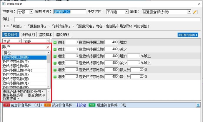 您可以打開選股中心新增策略,搜尋散戶,就會有相關可以使用的資料囉~