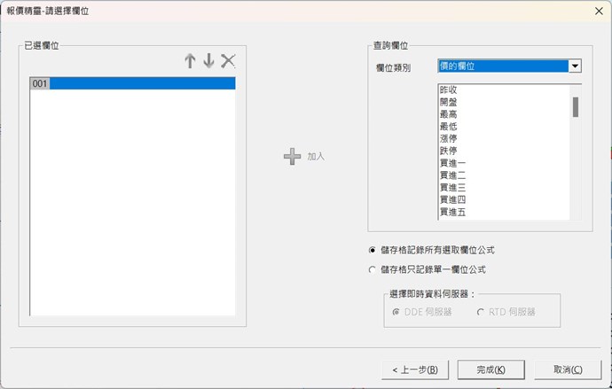 您好,XQ DDE/RTD輸出需使用"報價精靈"功能,欄位就是目前的對話盒內看到的,可以由此選擇您需要的欄位。