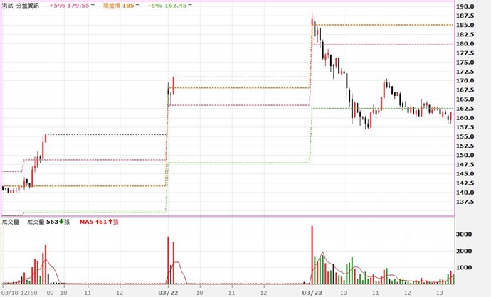 另,你提供的數據有問題哦 ! 3/22 收盤價是 171,所以 3/23 的漲跌數據應該是 179.55 和 162.45,但你的擷圖數據 -5% 是 162.86。