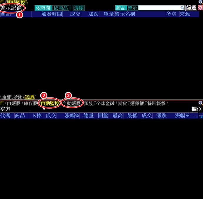 1.警示,這個在XScript中寫『警示』,然後加入策略雷達中,也就可以做洗價的動作,盤中符合條件也就會像是跳出警示視窗那樣,也會多次觸發,所以就當程式符合策略的一個記錄,這個我曉得。