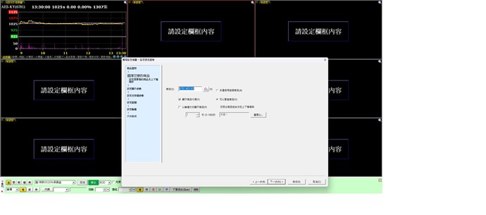 若是要看多檔商品的走勢或技術線圖,也可以自行設計看盤頁面(如您上方所提供永豐金證券的畫面,此並非多圖比較,而是自定義一個自訂頁面並分割為9格,每個欄框都設定為商品盤勢)。關於自訂頁面可參考以下功能教學:【如何自設畫面(一)】