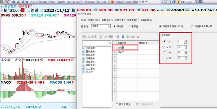 您好,目前可以在技術分析「成交量」副圖指標,自行設定MA的日期參數;