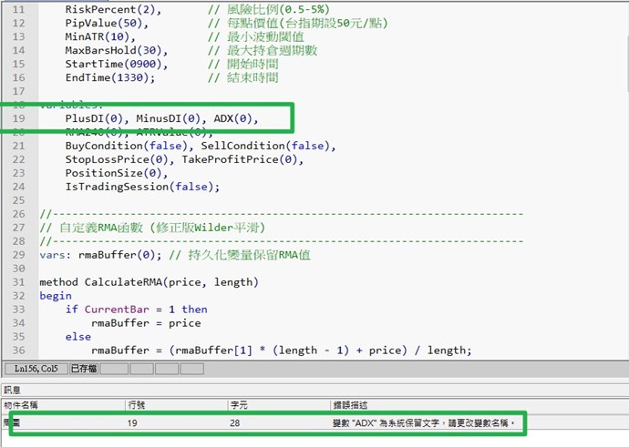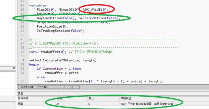 於是我把ADX改為adx_value但錯訊(圖2):Buy不允許當成變數開頭,請更改變數名稱