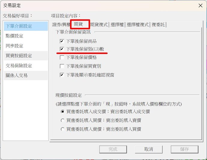 您好,可以使用功能表「交易/交易設定」,在項目設定內容(證券、期貨或其他商品為各別設定)勾選“下單後保留張(口)數”試看看。