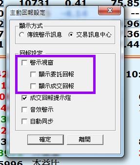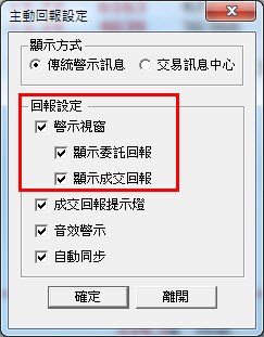 可以到功能表「交易/主動回報設定...」設定關閉"警示視窗"。