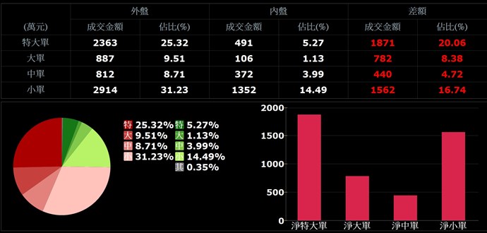 內盤外盤的資訊,您可以用 GetField("內盤量") 、 GetField("外盤量") 、 GetField("內盤金額") 和 GetField("外盤金額") 來取得。
