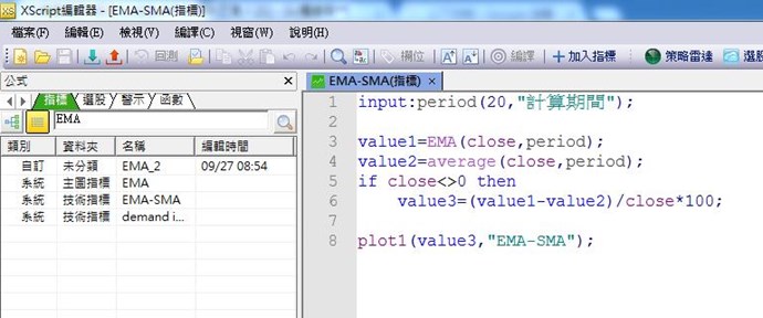 在XS編輯器系統_技術指標中,有EMA-SMA的程式碼唷~ 如圖,謝謝。