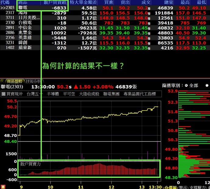 上面的資料是 散戶買賣超張數,是由 散戶買張 ─ 散戶賣張 計算得出。