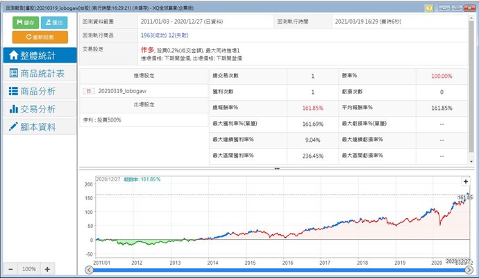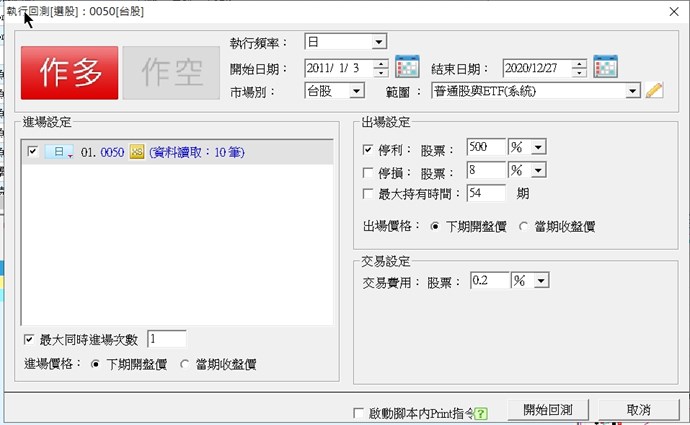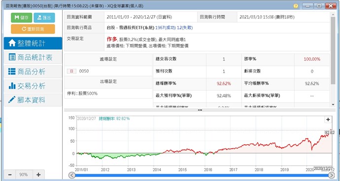 我寫了一行程式, 只買 0050, 且將停利設為 500%, 也就是在買進後, 一直持股而不出場.