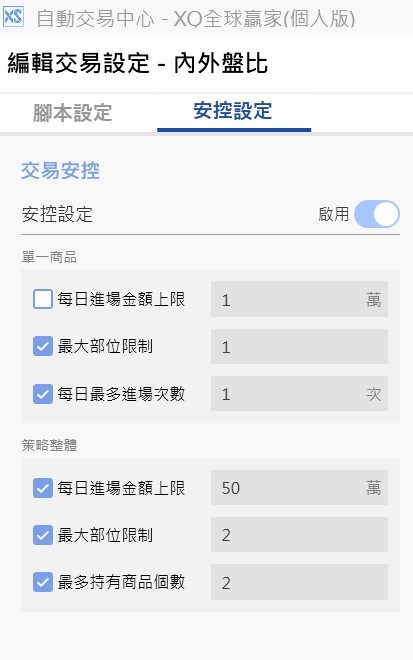 最大部位限制:每個執行商品的部位的絕對值的加總。