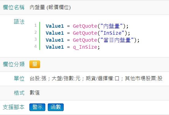 P.S. 不過 GetQuote("內盤量") 報價欄位資料有支援期貨/選擇權商品。