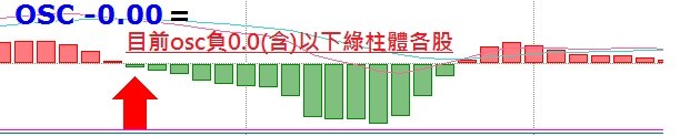 如何才能選出目前OSC小於負0.0(含)以下的綠柱狀體各股,頻率為還原日線(如圖)