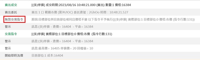 另外圖中的無效交易指令是重複下出部位相同且委託價相同 (或同為市價) 的委託單時,因為是一模一樣的委託單故不會執行。