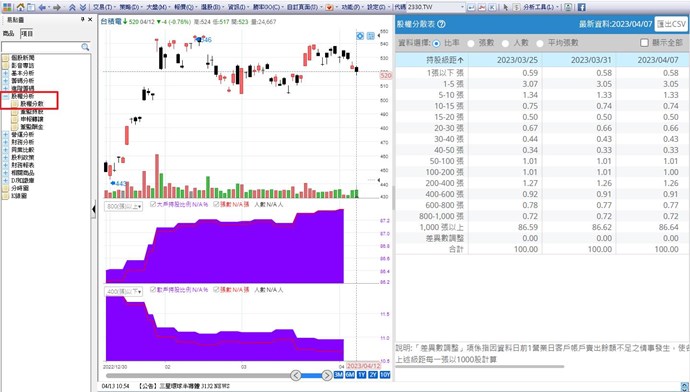 ※選擇個股商品(例如台積電2330),在商品名稱上按右鍵點選「基本資料」,可進入盤後頁面,再點選左邊功能表的「股權分析」即可。