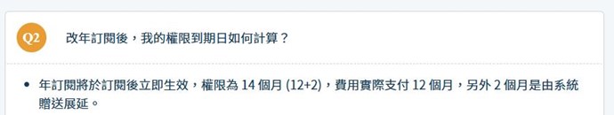 購買年訂方案成功後,第13、14個月,當下系統會自動展延權限。