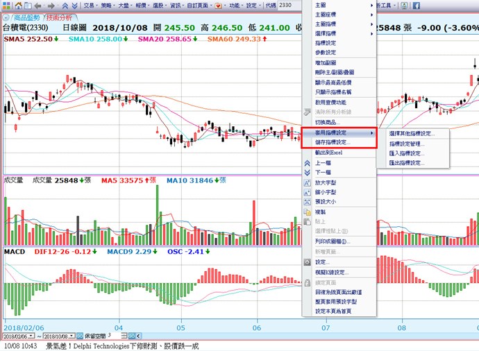 您好,在技術分析上點按右鍵,可以執行「儲存指標設定」將目前指標儲存起來,