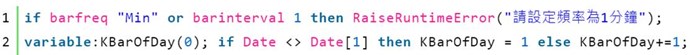問題二: 接續上一個問題, 如果是寫成 Variable: KBarOfDay(0);KBarOfDay=0; if Date<>Date[1] then KBarOfDay=1 else KBarOfDay+=1; 執行的時候KBarofDay是不是都會歸回0呢?