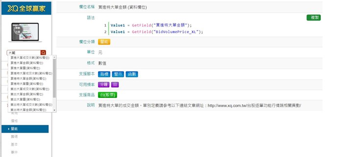 請教外盤特大單成交金額 ,外盤特大單佔比,內盤特大單成交金額 ,內盤特大單佔比,特大單差額成交金額 ,特大單差額佔比,外盤大單成交金額 ,外盤大單佔比,內盤大單成交金額 ,內盤大單佔比,大單差額成交金額 ,大單差額佔比,請問欄位名稱如何找尋?