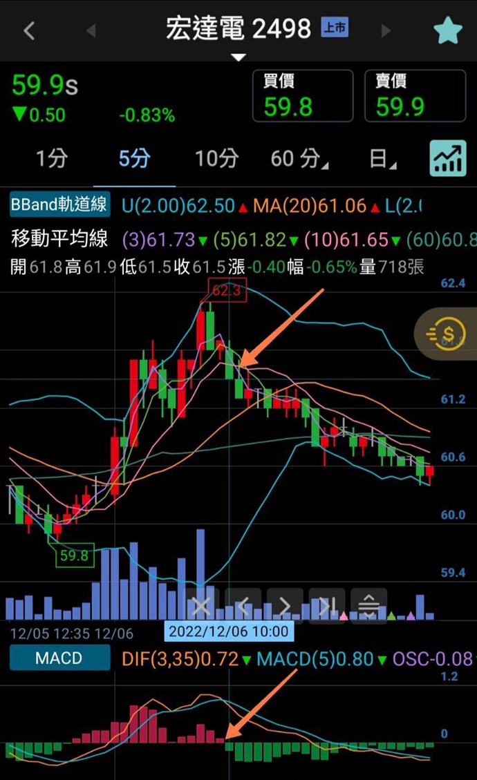 另外請教小編,如圖宏達電,當符合訊號09:55正轉負,第一根10:00箭頭這根跑完後,第二根10:05才會出現訊號,我想要當下正轉負(OSC 0)的下一根也就是10:00圖片箭頭這根就出訊號。