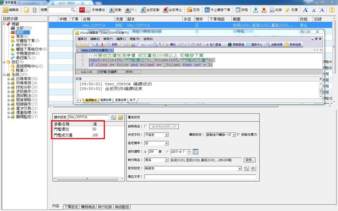新增並編譯成功後,加入策略雷達,在內容腳本設定處,可以Key入您的門檻價位與門檻成交量數值,如下圖紅框處