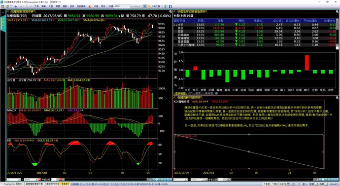 在圖中右下角的欄框, 預想的功用是能夠在上頭利用技術分析工具(註解)將後續的操作提示記錄在這做為"提醒", 它不隨時間改變而滾動, 目前這個區域用的是"技術分析", 設定不顯示主圖, 然而由於系統強制要一個副圖, 故選了個XS系統指標並設定線條不顯示,並且不即時更新, 碰到一個問題就是可用的區域SIZE有限制, 例如Y軸僅僅能使用一半.