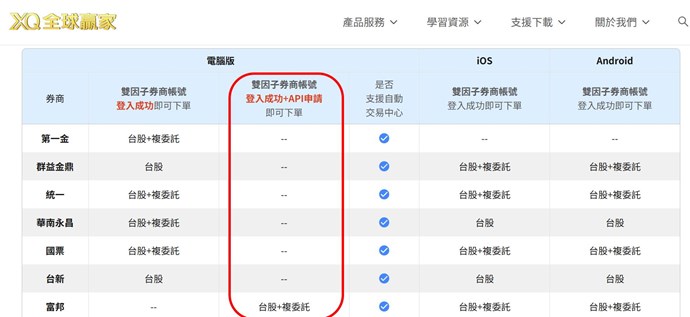 XQ證券帳務目前僅支援富邦證券:https://www.xq.com.tw/faq/b3d25f61