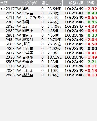 settotalBar(0); if volume > 0 then begin ret = 1; retmsg = text("0 ",NumToStr(getField("成交金額(元)","D")/100000000,2),"億"); end;