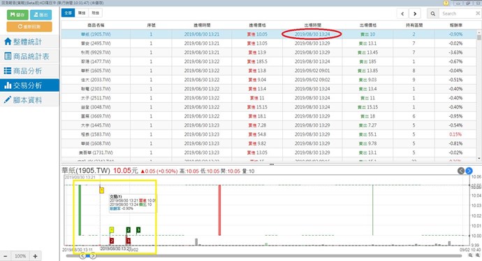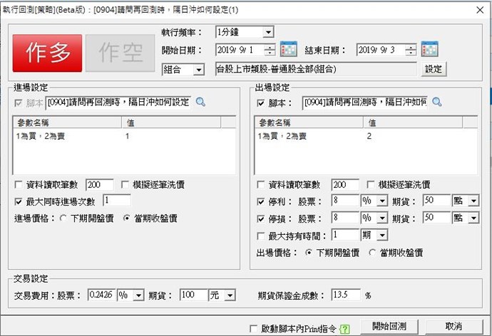 以上設定將會在下午1:20~1:25分,達成條件後進場 並且在隔日的第一根K棒,且符合條件時出場 以上說明,謝謝。
