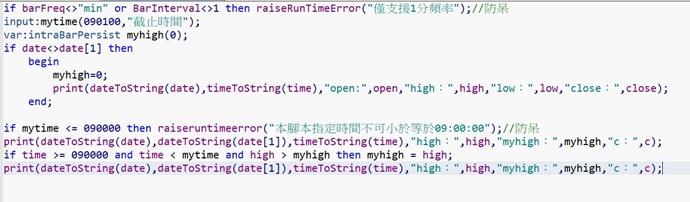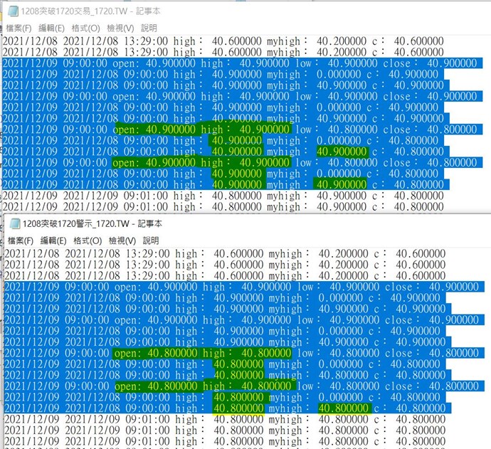我最近在回測遇到一些問題,我使用警示、交易腳本(頻率為1分鐘)記錄每天第一分鐘k的最高價,我print出來的結果發現警示與交易腳本紀錄第一分鐘k的最高價的價格不一樣,(畫面資料圖一圖二)為我撰寫的警示腳本與交易腳本,程式碼都一樣,但(畫面資料圖三)回測出來的結果卻不一樣,煩請小編幫忙解答,謝謝