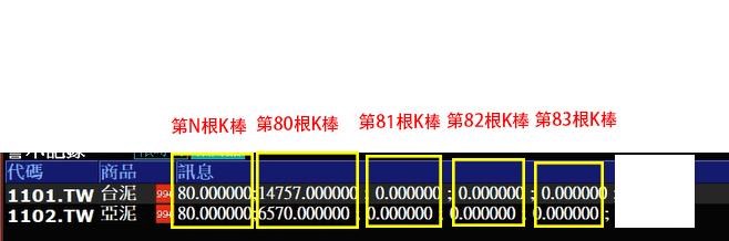 訊息的第一個數字代表第N根K棒,比如上圖是80就是10:20