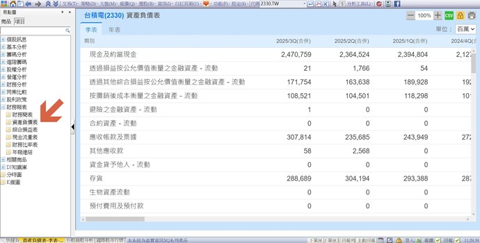 您好,請在電腦版查詢商品的盤後資料(在商品名稱上按右鍵,選取“更多個股分析”,此為盤後頁面),再點選「財務報表→資產負債表」即可。