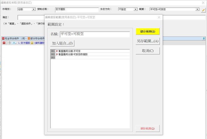 因為我會做空留倉 所以我其中一個組合是要可以放空的股票 所以我在編輯裡面設定了範圍 拉了2個看盤分類