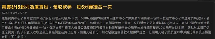 我在20240314挑標的時,商品選用買賣現沖有挑到5386青雲,但我隔一天3/15回測時發現沒有這檔標的,經查詢過後發現3/15時他被處置所以沒有在買賣現沖裡,但我條件只設定收盤價大於1回去看3/13的收盤價資料發現也沒有5386此檔,照理說回測或是查看日期會以當時數據為準,為何現在這檔沒有買賣現沖過去沒有處置時也沒有在買賣現沖裡?