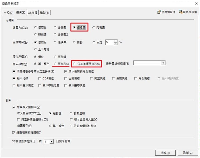 ●「依前後價漲紅跌綠」功能,只有支援選擇“連線圖”可顯示使用。