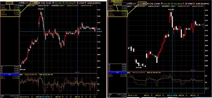 在5分K的指標頁面上,使用了跨頻的RSI函數分別計算