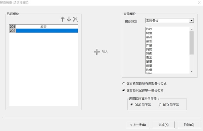 依據您的需要,將想要的報價內容移至左邊的欄位。以上圖為例,選擇成交,然後按一下完成。