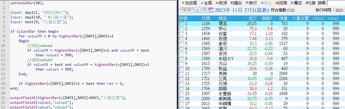 if value99 = highestBar(v[DAY1],DAY2)+1 and value99 = test