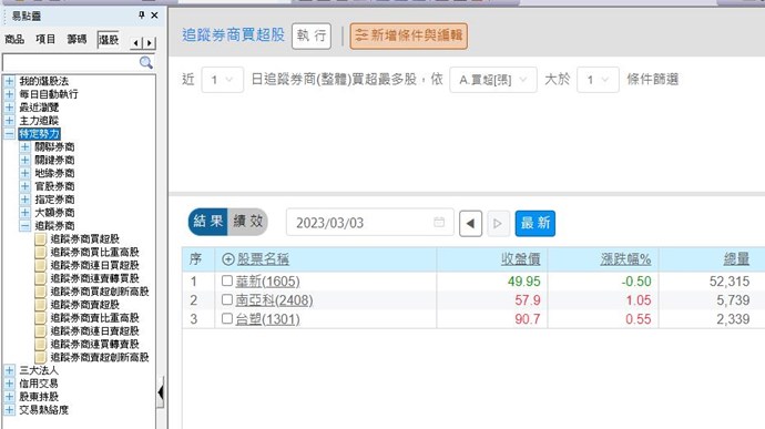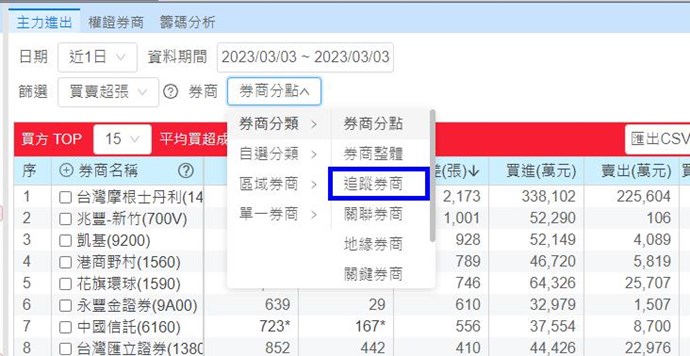 您好,可以由功能表「策略/籌碼分析/籌碼選股」,如下圖選單可查看追蹤券商有進出那些股票: