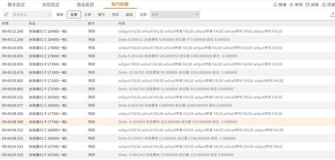 如以下圖示 腳本中 Delta 小於-0.55 會被執行市價平倉 ,建立新倉沒問題 但是買入平倉卻沒被執行