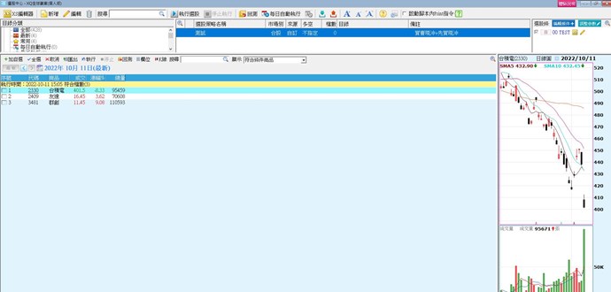 今日(10/11過檔後)盤後執行選股可篩出2330、3481、2409