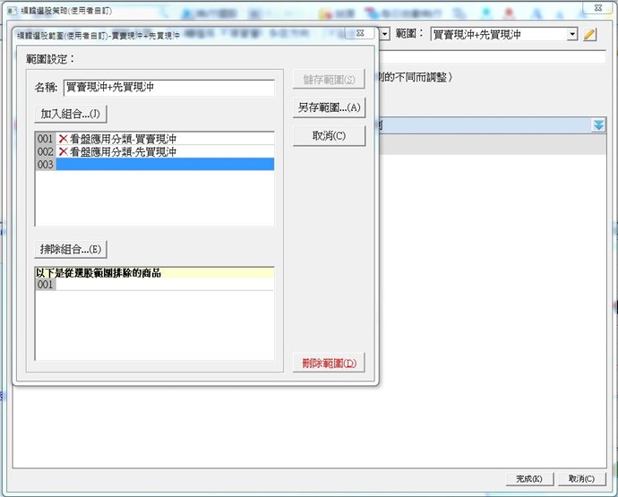 請問我在選股中心編輯策略,其中範圍如附檔,自行設定看盤應用分類中的「買賣現沖」及「先買現沖」的組合,