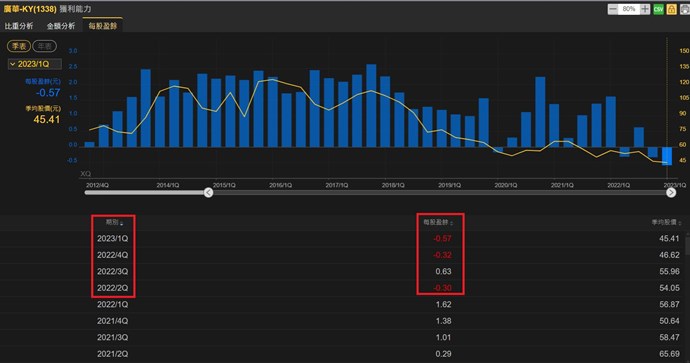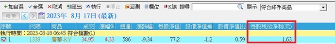 我的策略出了一檔股票,1338 廣華-KY,選股中心的 每股稅後淨利是 1.63,可是回到易點靈 去看 4季的每股盈餘加起來是負的,跟選股中心出來的數據不一樣,選股中心的每股稅後淨利我用的頻率是年。