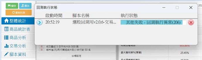 一般來說,206是回測逾時的狀況,或許您可以嘗試將回測區間縮短看是否有辦法解決。