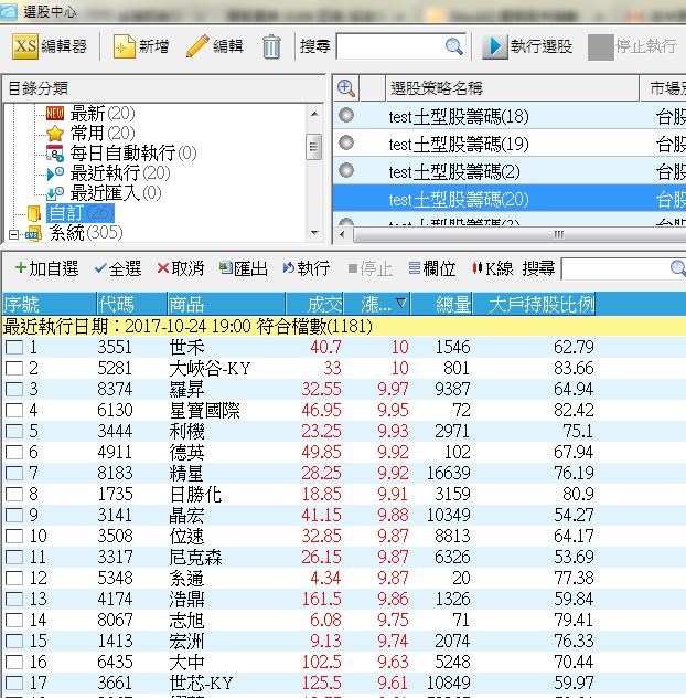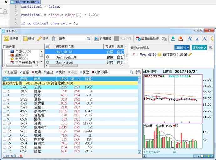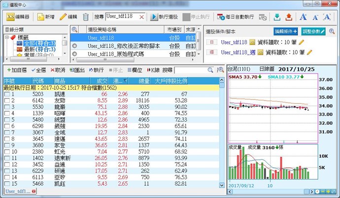 最後在同一個選股策略加入這兩個選股腳本,就可以篩選出符合條件的商品: