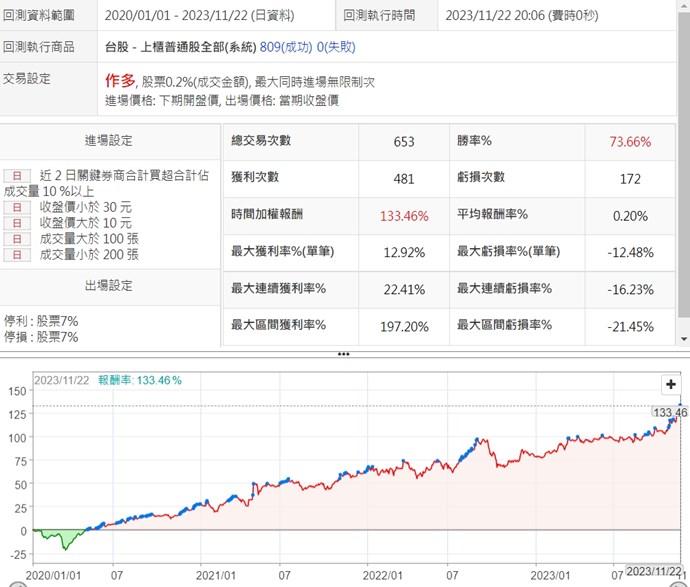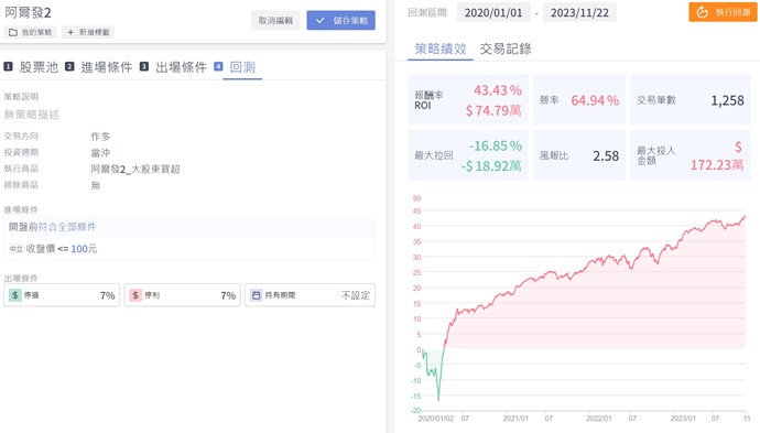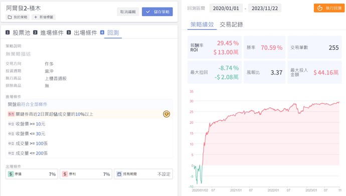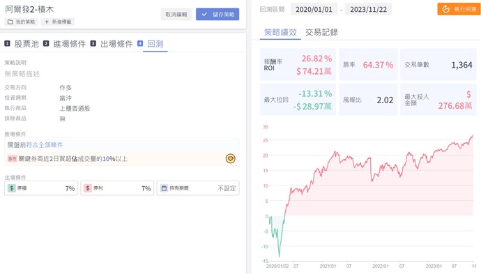 積木用了兩個,一個商品來源是選股、一個是用積木內建的條件用出的相同策略