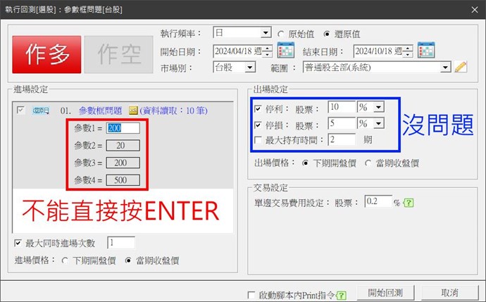 進場設定區:如參數1從200改為100,直接按ENTER進行回測,參數1仍以200作回測,並非100出場設定區:無論停利、停損、持有期間,修改後直接按ENTER進行回測,都能以新參數作回測問題點:進場參數為動態產生控制項,目前未離開輸入焦點、無法更新參數,敬請修繕,謝謝