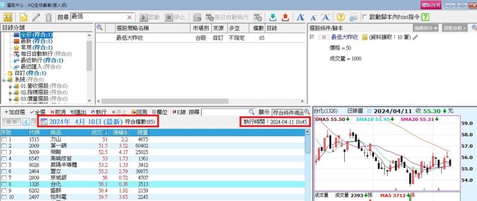 第一張圖是選股的結果,使用的是4/10收盤的資料選股,結果完全符合。第二張圖使用的是4/11盤中即時的資料,兩者沒有直接關係。