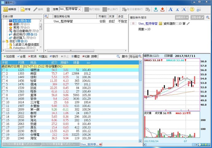 下圖是小幫手用選股腳本撰寫當期K棒,MO指標突破100時,則挑選該股的選股中心列表