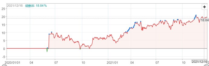 然而,選股回測的績效曲線跟交易回測的時間加權報酬曲線卻差異非常大,尤其是2021年那段,