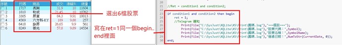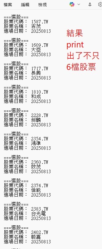 如圖,選股中心選出6檔股票,但是卻print出10幾檔